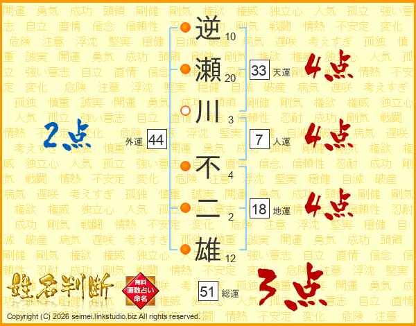 逆瀬川不二雄さんの総運は51画の3点!