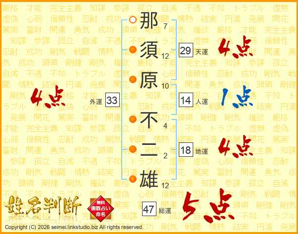 那(7画)須(12画)原(10画) 不(4画)二(2画)雄(12画)