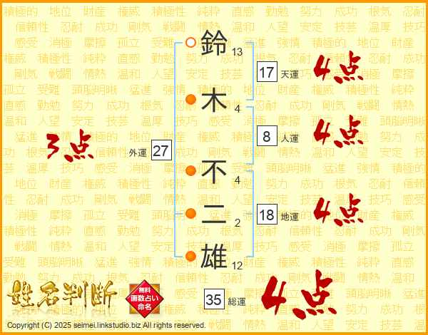 鈴(13画)木(4画) 不(4画)二(2画)雄(12画)