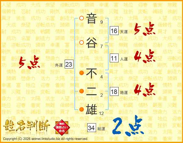 音(9画)谷(7画) 不(4画)二(2画)雄(12画)