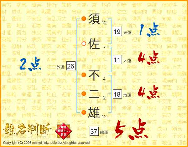 須佐不二雄さんの総運は37画の5点!