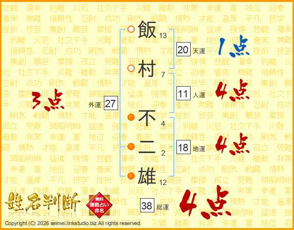 飯(13画)村(7画) 不(4画)二(2画)雄(12画)