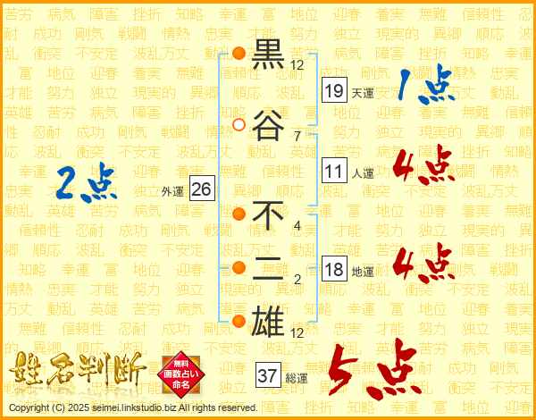 黒(12画)谷(7画) 不(4画)二(2画)雄(12画)