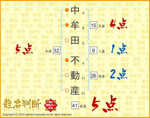 中(4画)牟(6画)田(5画) 不(4画)動(11画)産(11画)