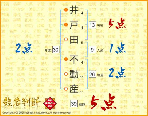 井(4画)戸(4画)田(5画) 不(4画)動(11画)産(11画)