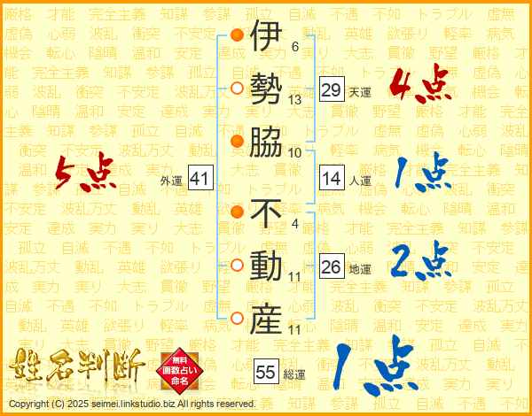 伊(6画)勢(13画)脇(10画) 不(4画)動(11画)産(11画)