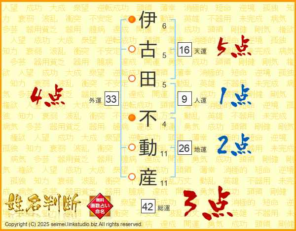 伊(6画)古(5画)田(5画) 不(4画)動(11画)産(11画)