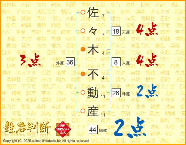 佐々木不動産さんの総運は44画の2点!