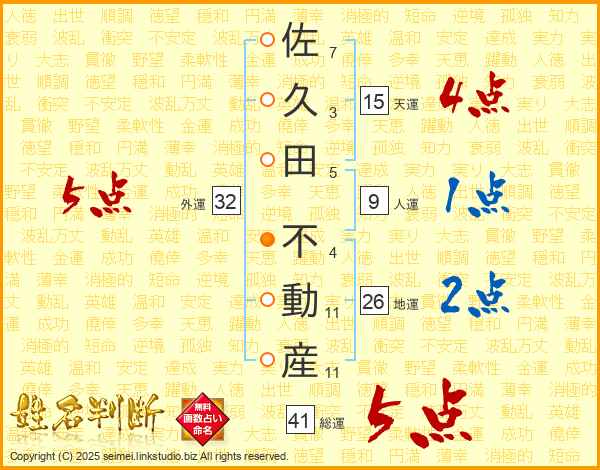 佐(7画)久(3画)田(5画) 不(4画)動(11画)産(11画)