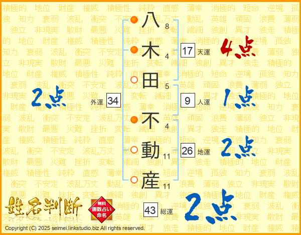 八(8画)木(4画)田(5画) 不(4画)動(11画)産(11画)