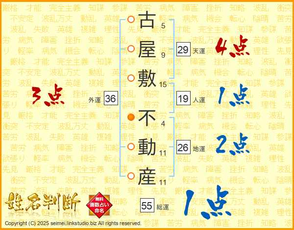 古(5画)屋(9画)敷(15画) 不(4画)動(11画)産(11画)