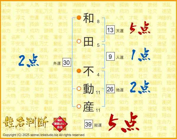生活面を象徴する運勢です。外部から受ける影響力を表し、結婚運、家庭運や職場、環境への順応性を表します。総運から人運を引いた画数。姓や名が1文字の場合を除く。