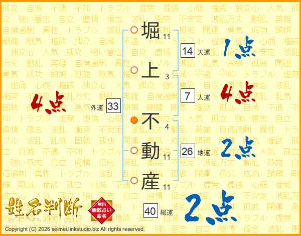 堀(11画)上(3画) 不(4画)動(11画)産(11画)