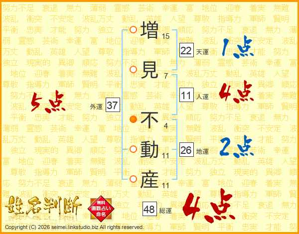 増(15画)見(7画) 不(4画)動(11画)産(11画)