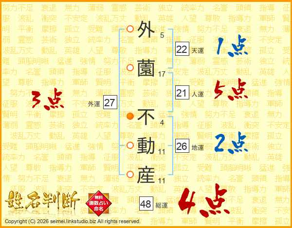 外(5画)薗(17画) 不(4画)動(11画)産(11画)