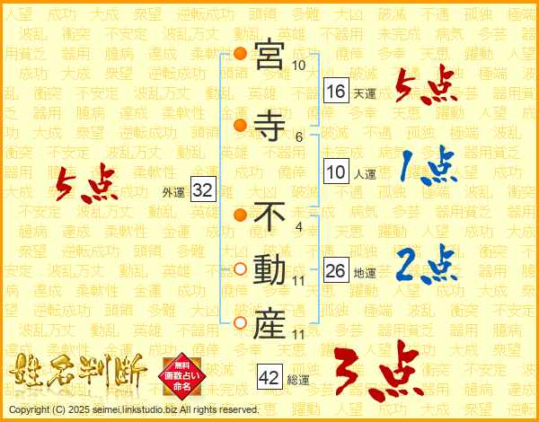 宮(10画)寺(6画) 不(4画)動(11画)産(11画)