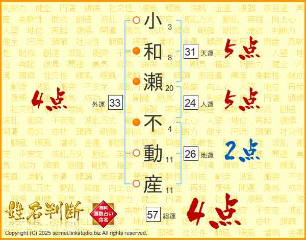 小(3画)和(8画)瀬(20画) 不(4画)動(11画)産(11画)
