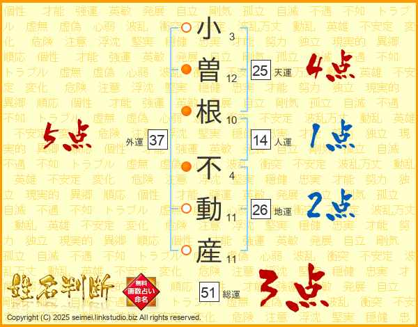 小(3画)曽(12画)根(10画) 不(4画)動(11画)産(11画)