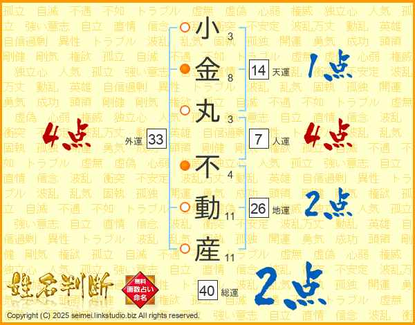 小(3画)金(8画)丸(3画) 不(4画)動(11画)産(11画)