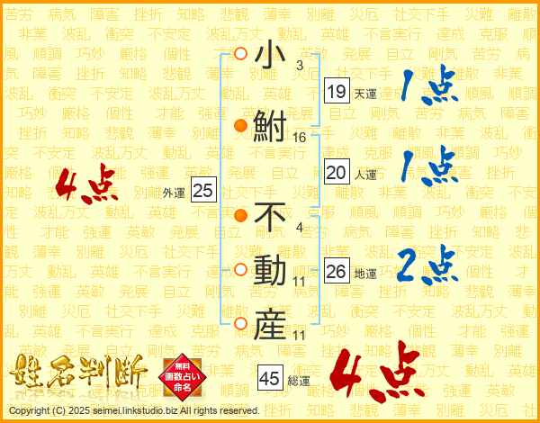 小(3画)鮒(16画) 不(4画)動(11画)産(11画)