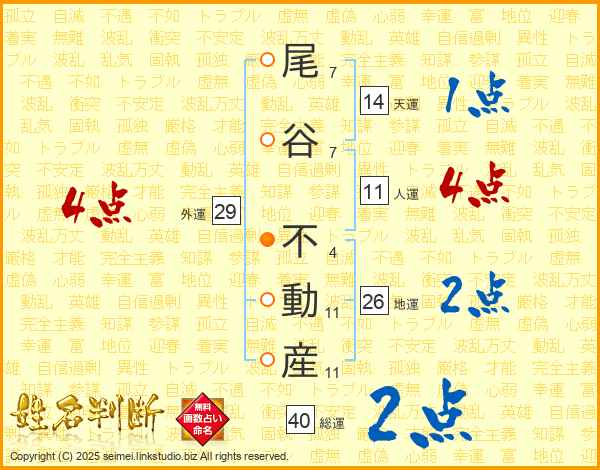 尾(7画)谷(7画) 不(4画)動(11画)産(11画)