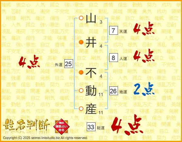 山(3画)井(4画) 不(4画)動(11画)産(11画)