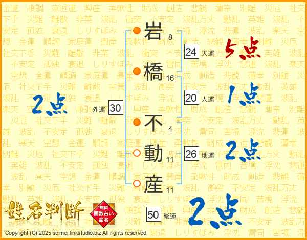 岩(8画)橋(16画) 不(4画)動(11画)産(11画)