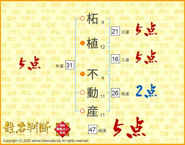 柘(9画)植(12画) 不(4画)動(11画)産(11画)