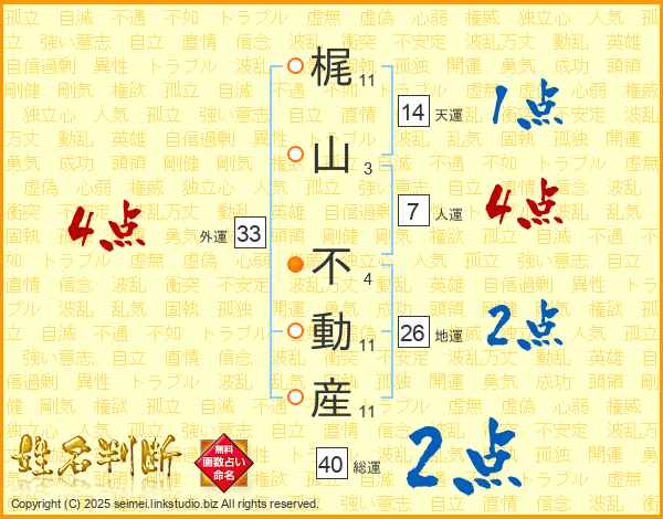 梶(11画)山(3画) 不(4画)動(11画)産(11画)