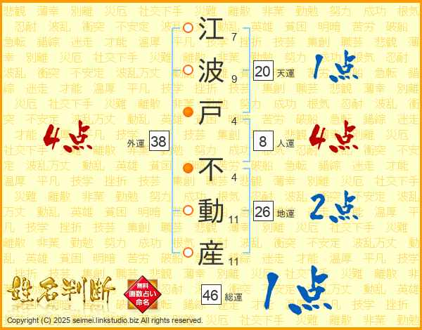 江(7画)波(9画)戸(4画) 不(4画)動(11画)産(11画)