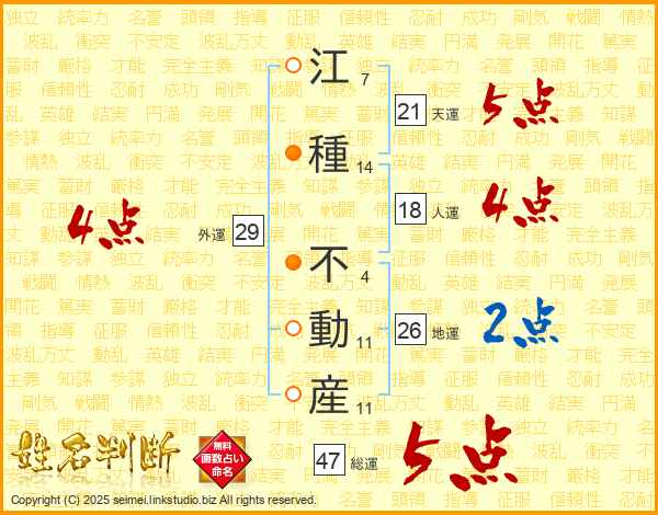 江(7画)種(14画) 不(4画)動(11画)産(11画)