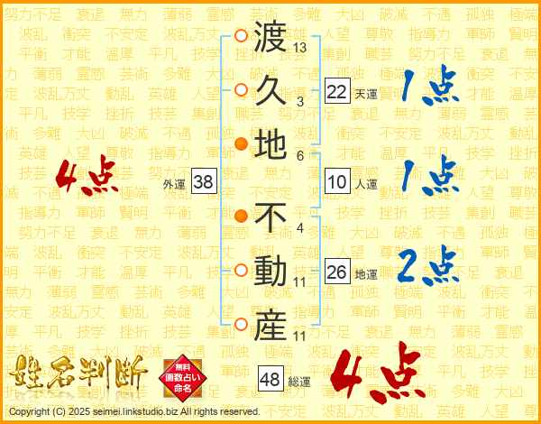 渡(13画)久(3画)地(6画) 不(4画)動(11画)産(11画)
