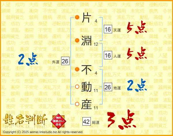 片(4画)淵(12画) 不(4画)動(11画)産(11画)