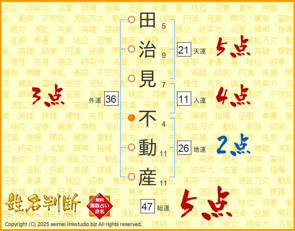田(5画)治(9画)見(7画) 不(4画)動(11画)産(11画)
