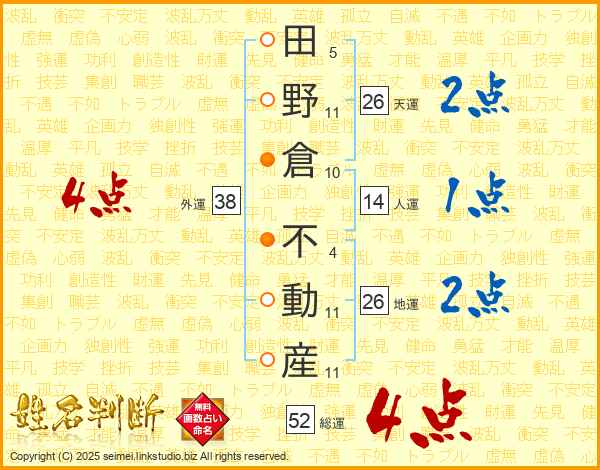 生活面を象徴する運勢です。外部から受ける影響力を表し、結婚運、家庭運や職場、環境への順応性を表します。総運から人運を引いた画数。姓や名が1文字の場合を除く。