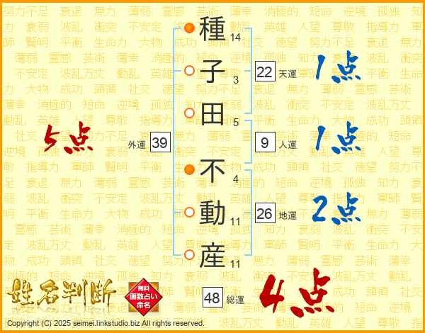 種(14画)子(3画)田(5画) 不(4画)動(11画)産(11画)
