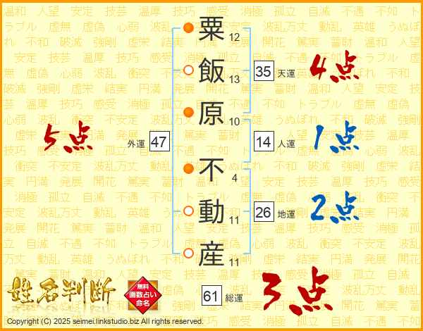 粟(12画)飯(13画)原(10画) 不(4画)動(11画)産(11画)