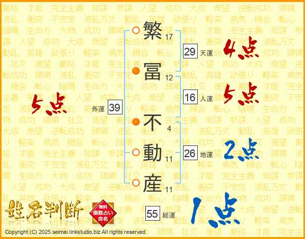 繁(17画)冨(12画) 不(4画)動(11画)産(11画)