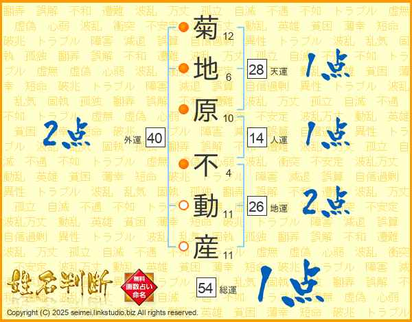 菊(12画)地(6画)原(10画) 不(4画)動(11画)産(11画)