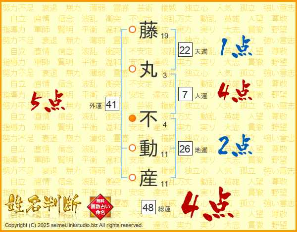 藤(19画)丸(3画) 不(4画)動(11画)産(11画)