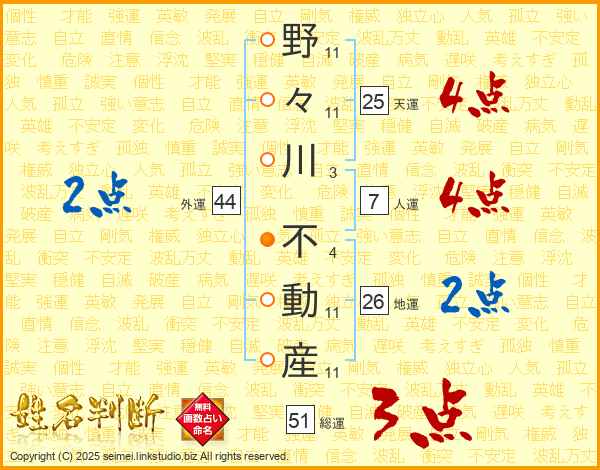 野(11画)々(11画)川(3画) 不(4画)動(11画)産(11画)