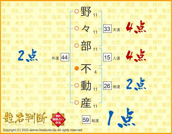 野(11画)々(11画)部(11画) 不(4画)動(11画)産(11画)