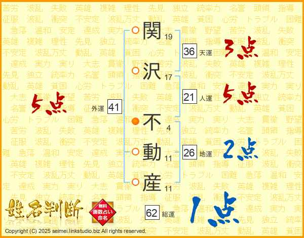関(19画)沢(17画) 不(4画)動(11画)産(11画)