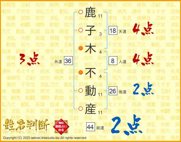 鹿(11画)子(3画)木(4画) 不(4画)動(11画)産(11画)