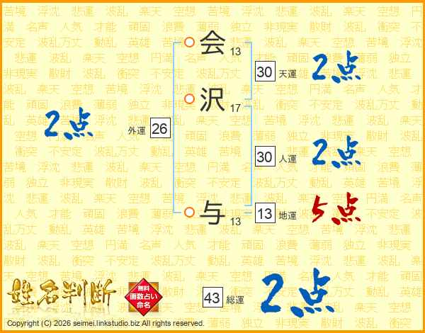 生活面を象徴する運勢です。外部から受ける影響力を表し、結婚運、家庭運や職場、環境への順応性を表します。総運から人運を引いた画数。姓や名が1文字の場合を除く。