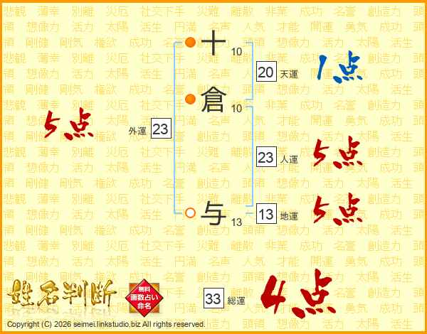生活面を象徴する運勢です。外部から受ける影響力を表し、結婚運、家庭運や職場、環境への順応性を表します。総運から人運を引いた画数。姓や名が1文字の場合を除く。