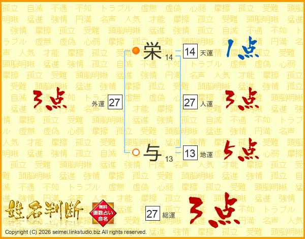 生活面を象徴する運勢です。外部から受ける影響力を表し、結婚運、家庭運や職場、環境への順応性を表します。総運から人運を引いた画数。姓や名が1文字の場合を除く。