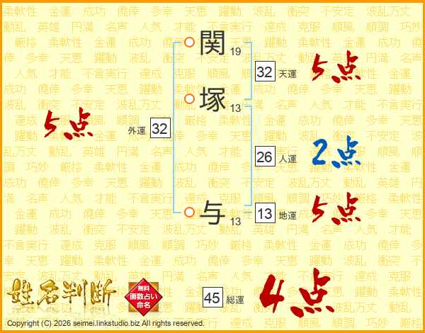 生活面を象徴する運勢です。外部から受ける影響力を表し、結婚運、家庭運や職場、環境への順応性を表します。総運から人運を引いた画数。姓や名が1文字の場合を除く。