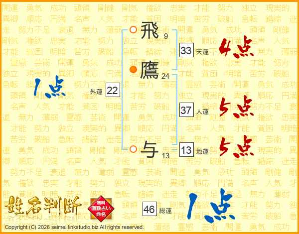 飛鷹与さんの総運は46画の1点!