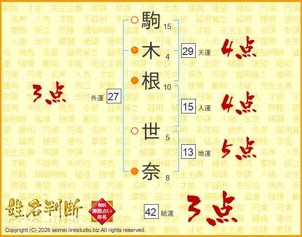 駒(15画)木(4画)根(10画) 世(5画)奈(8画)